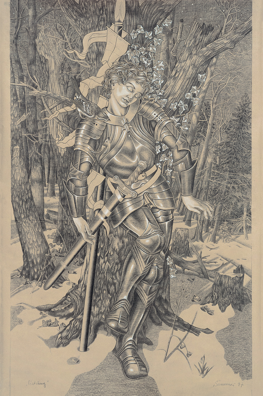 Frank Sämmer, Lichtung, 1997, Kohle, Kreide / Packpapier, 180 × 110 cm (Privatsammlung)