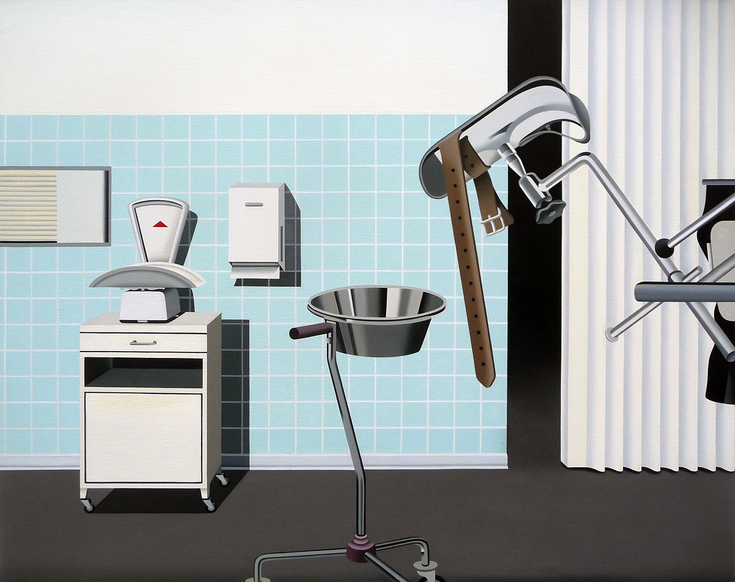 Jan Schüler, Über die Geburt, den Tod und das Leben dazwischen. Erinnerung an Maina-Miriam Munsky: Kreißsaal, 2017, Öl auf Leinen, 120 x 150 cm (Diptychon, linker Flügel)