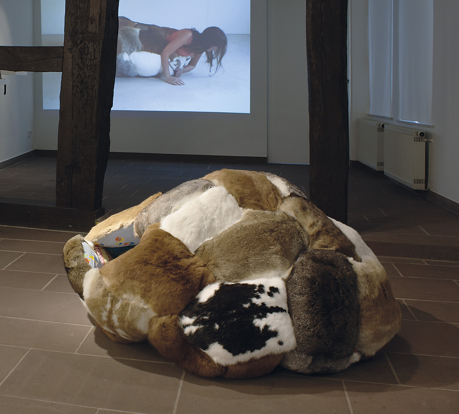 Julia Arztmann, Der Triumphator, 2017, Objekt und Video; Kaninchenfelle, Textilien, Füllwatte