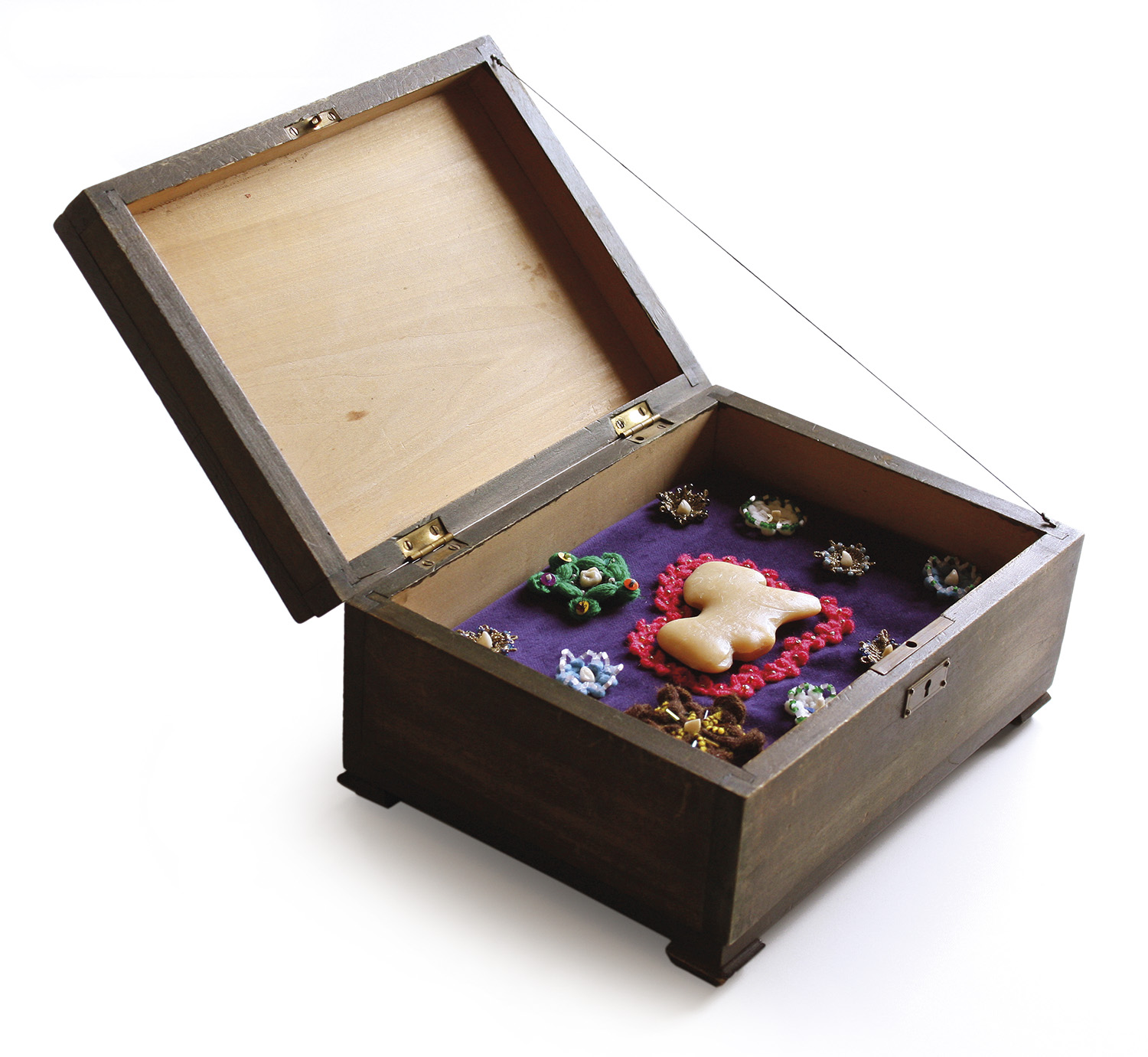 Julia Arztmann, Reliqiuenschrein, 2014, Holzkiste, Samt, Borten, Perlen, Zähne, Seife
