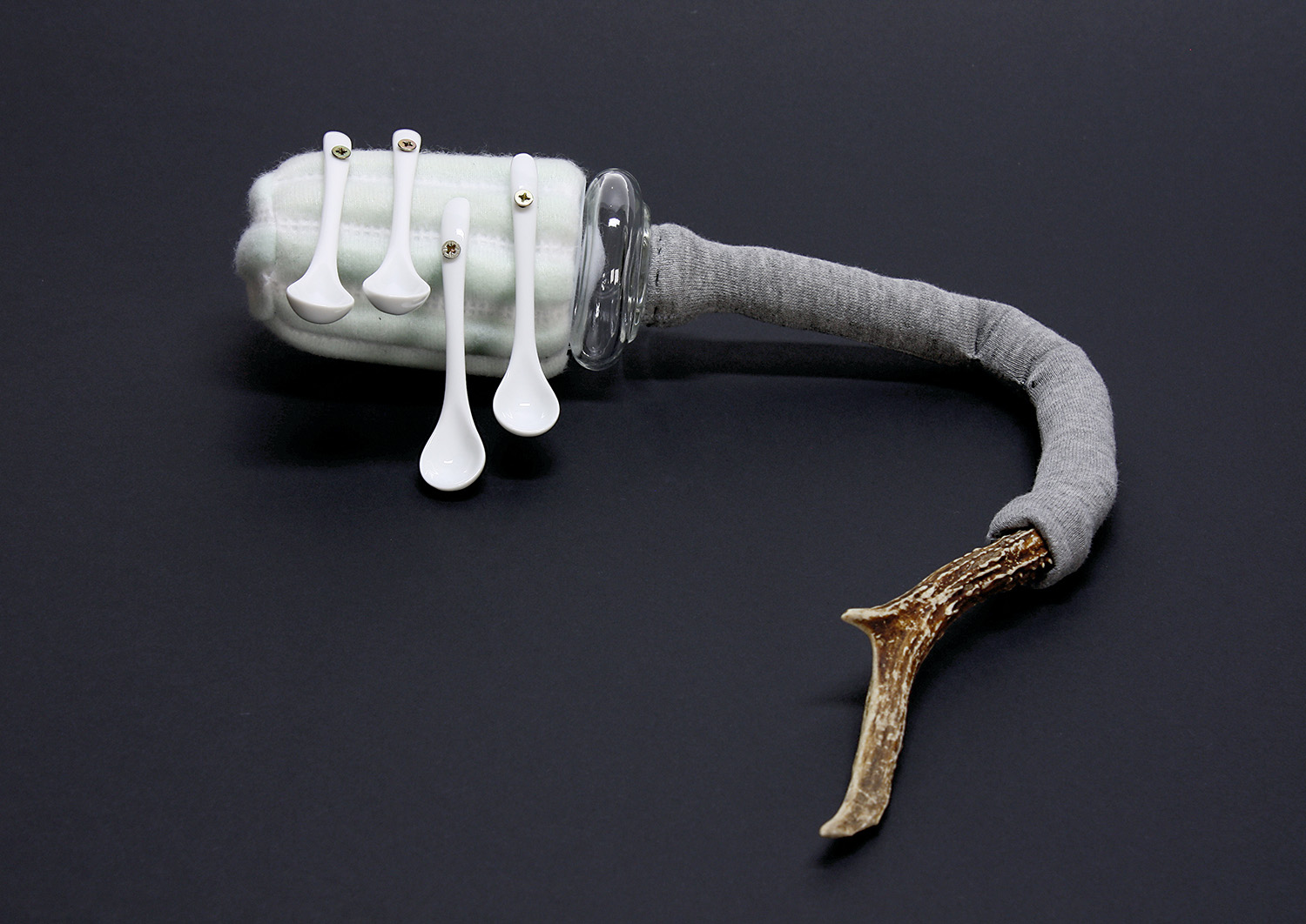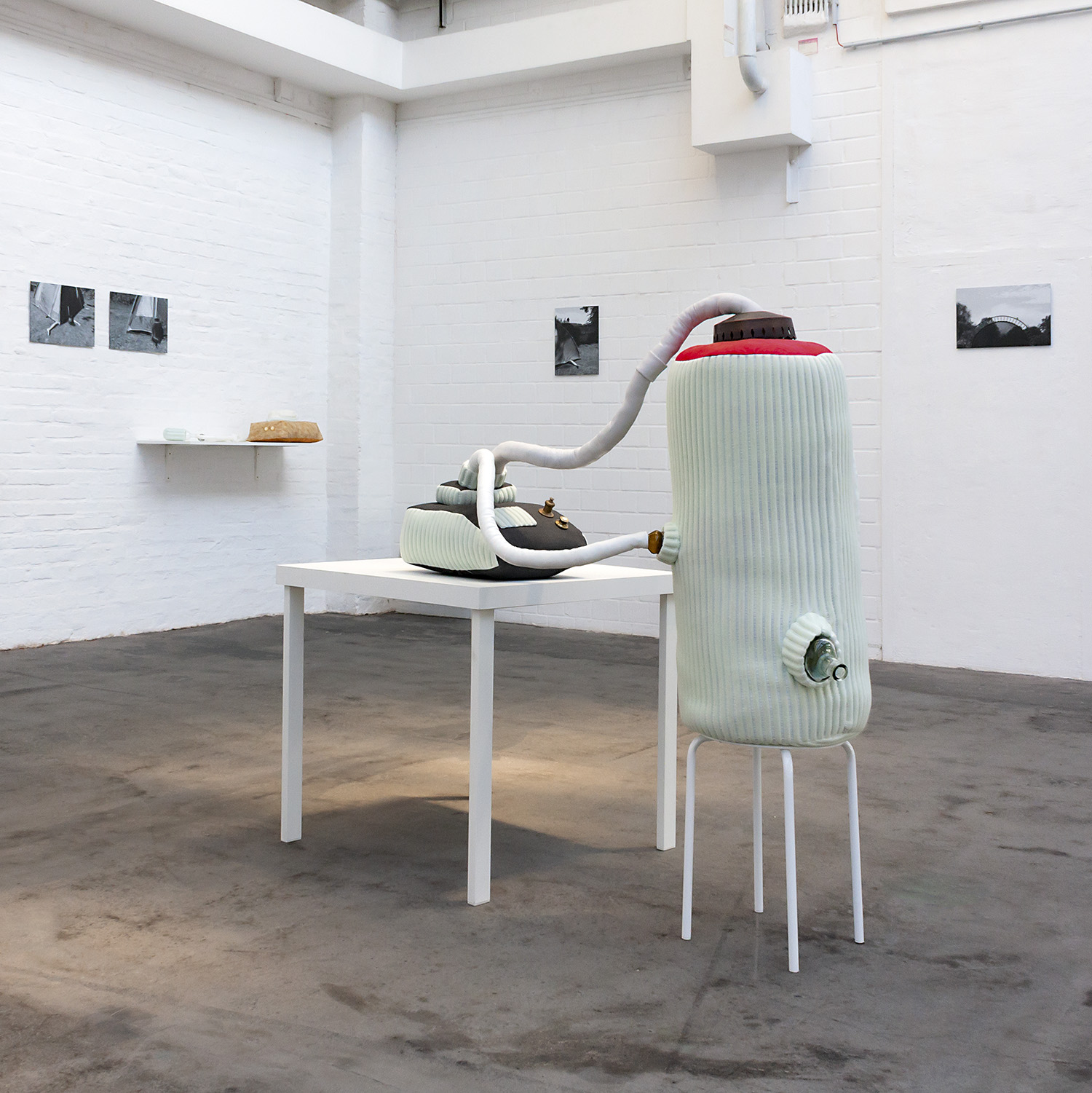 Julia Arztmann, Apparatus, 2016, Textilien, Füllwatte, Flaschen, Metallteile