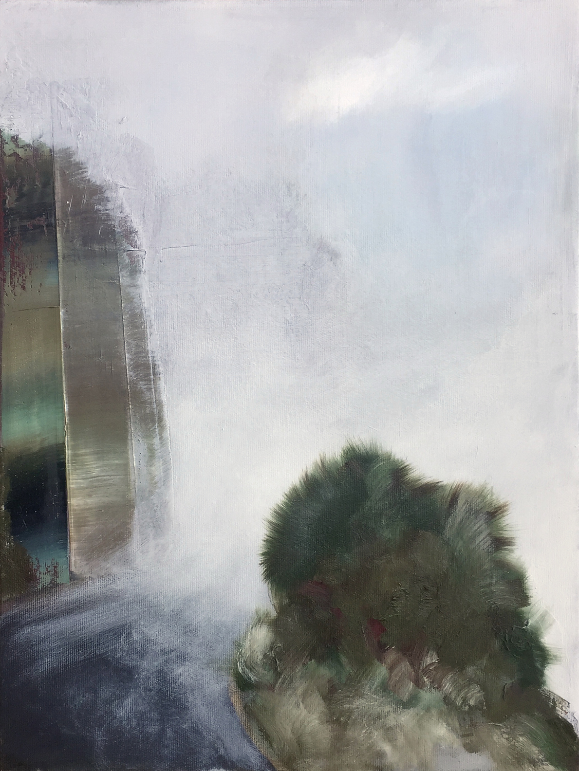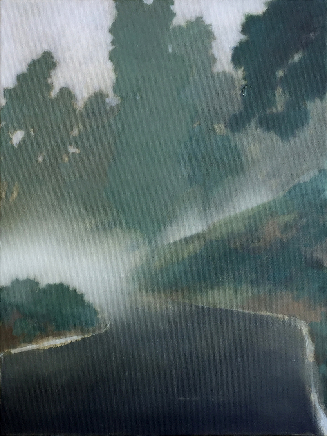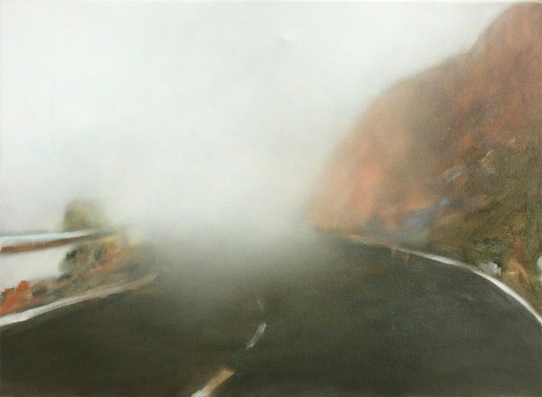 Serpentinenstraße im Nebel, 2022, 45 x 35 cm, Ölfarbe auf Leinwand