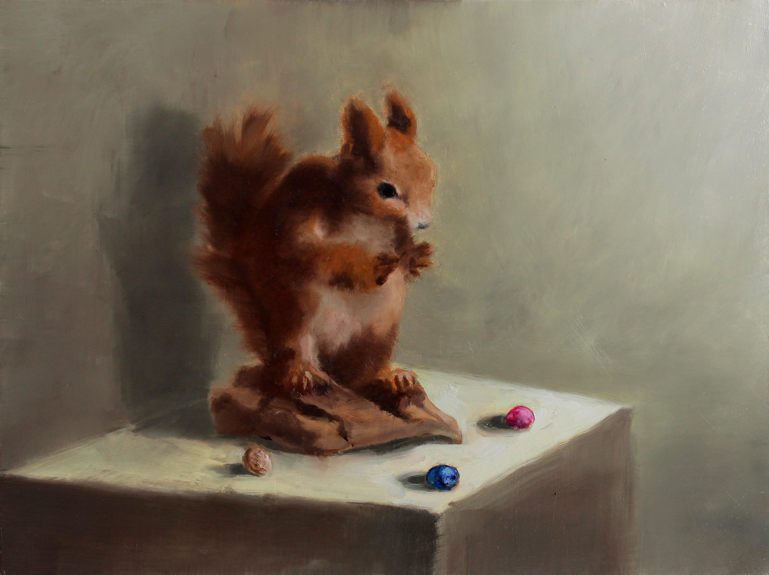 The Matrix-Squirrel (the red nut or the blue nut?), 2019, 30 x 40 cm, Ölfarbe auf Holz