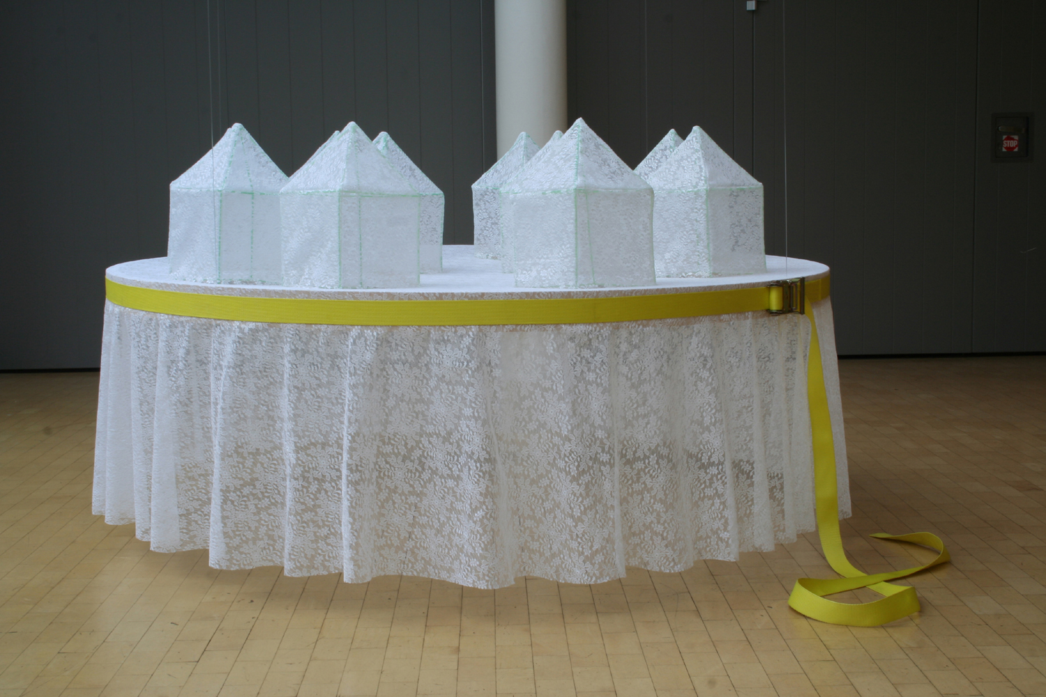 Monika Lioba Lang, 10 Fragen an Sibylle, 2006, Material: Gardinenspitze, Schichtholzrahmen, Spanngurt, Trinkhalme