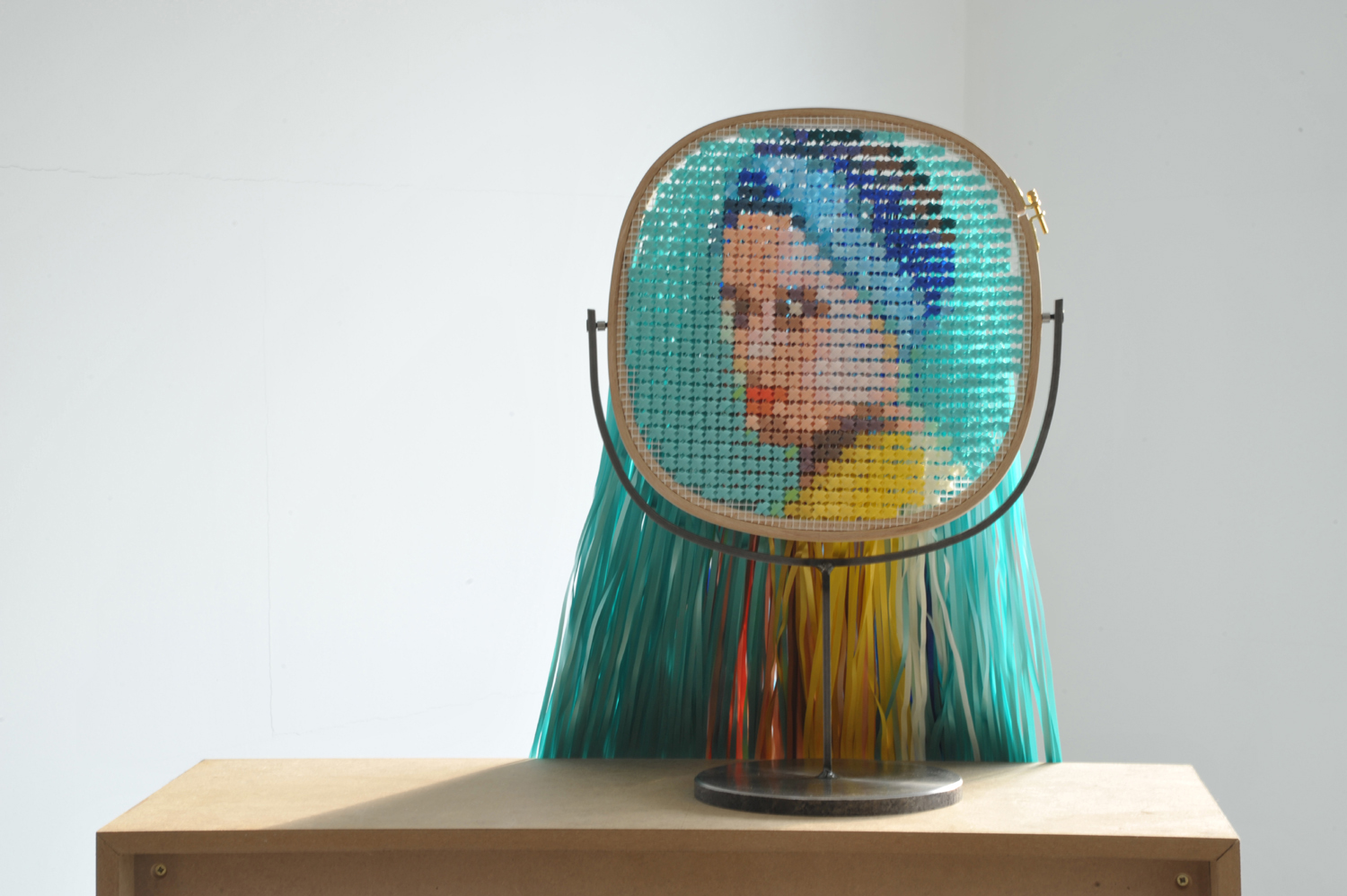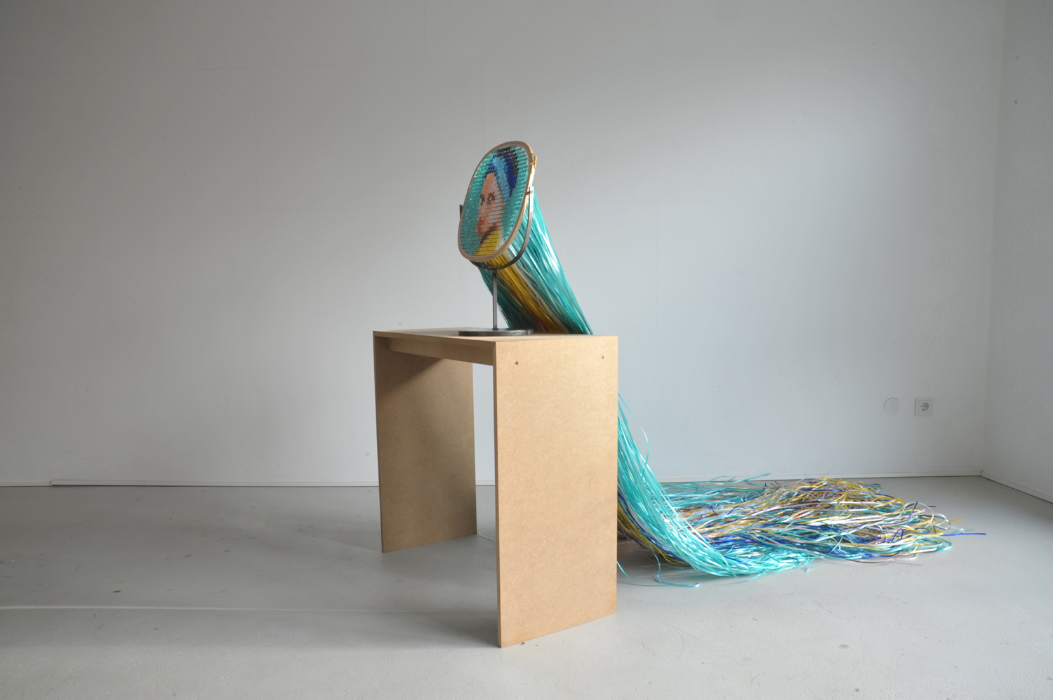 Monika Lioba Lang, Spieglein, Spieglein, 2011, Polyband, MDF, Stahl, Stickrahmen
